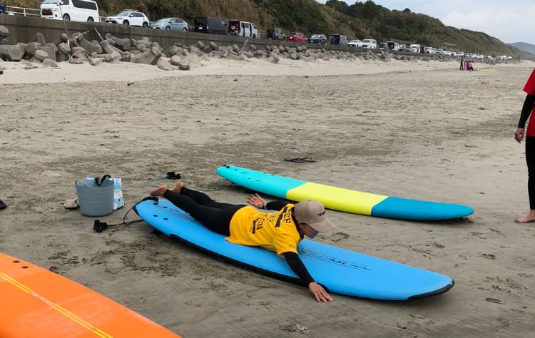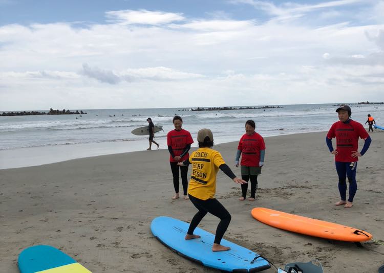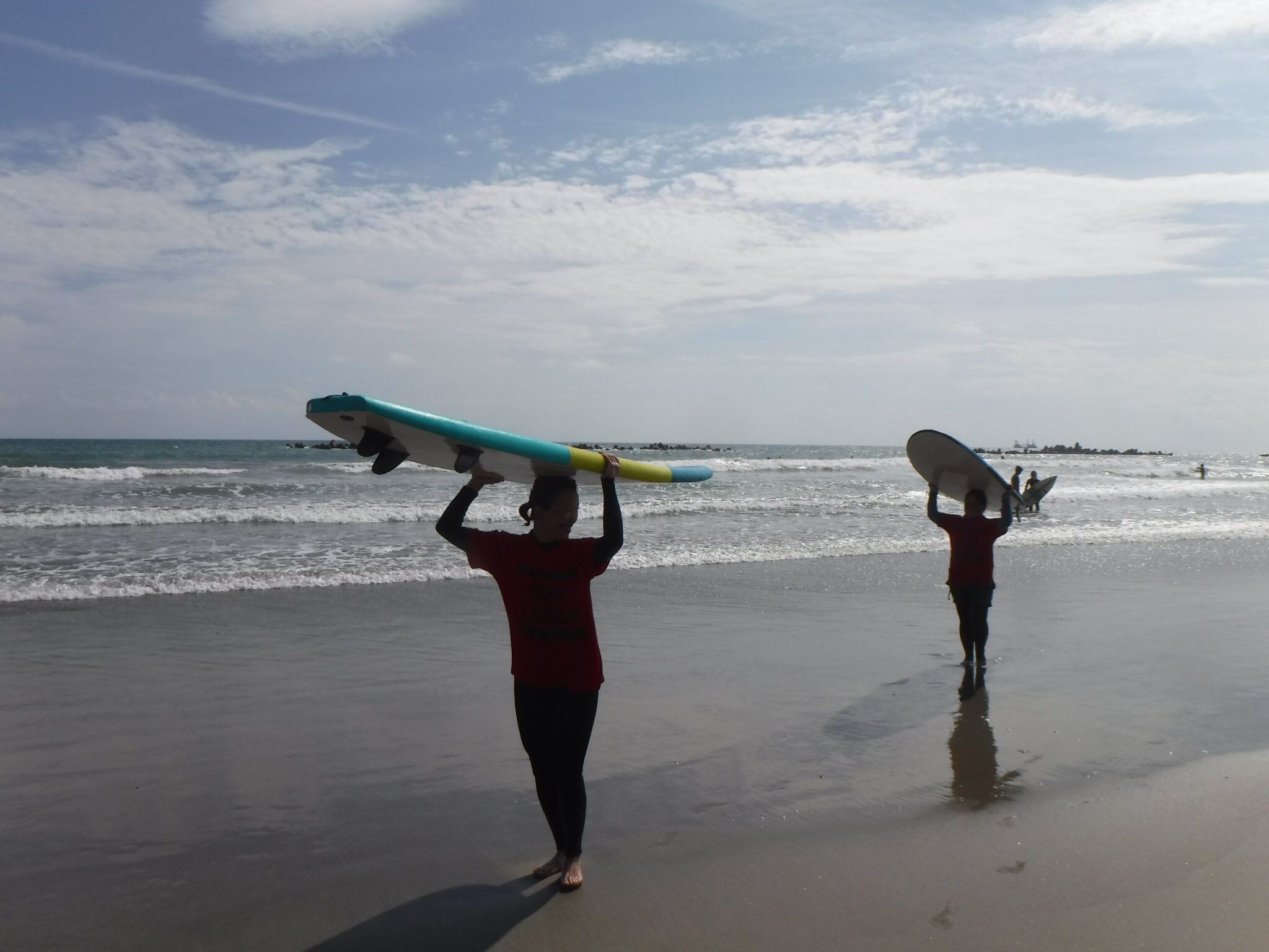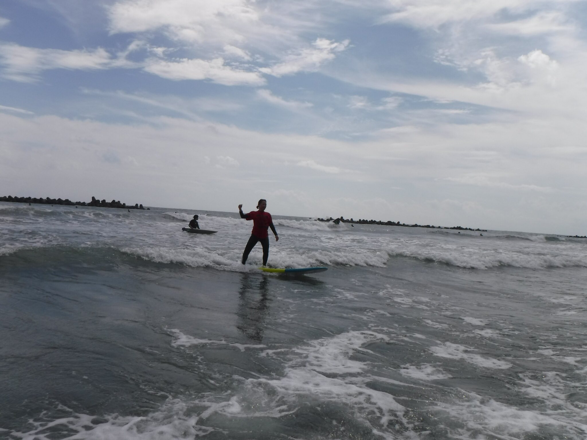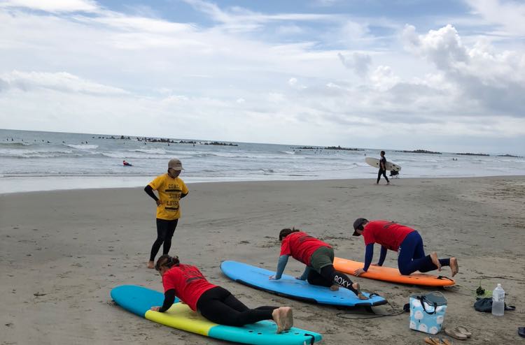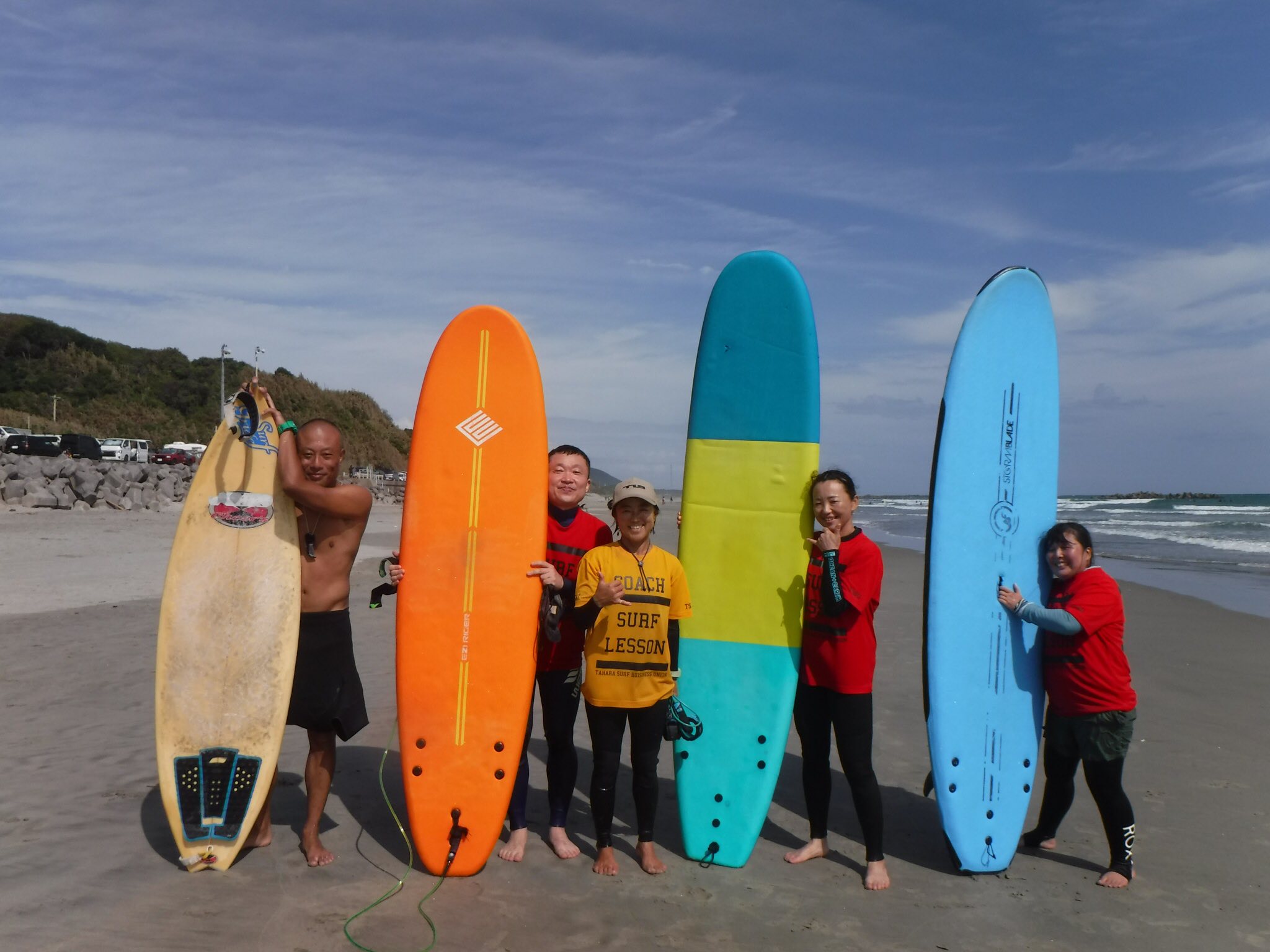 この日は風が強く新日ポイントへ移動してサーフィンスクールを行いました。