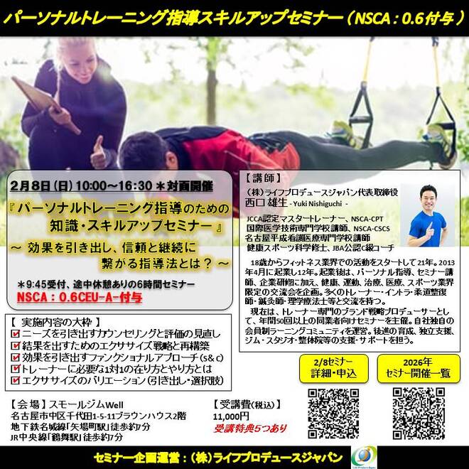 パーソナルトレーニング指導のための知識・スキルアップセミナー ~ 効果を引き出し、信頼と継続に繋がる指導法とは? ~(NSCA:0.6CEU-A-付与、名古屋開催)
