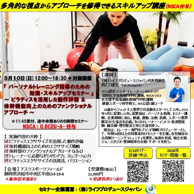パーソナルトレーニング指導のための知識・スキルアップセミナー ~ ピラティス等を活用した動作評価&体幹機能向上のためのファンクショナルアプローチ ~(ピラティス編、NSCA継続単位:0.6CEU-A-付与、浜松開催)
