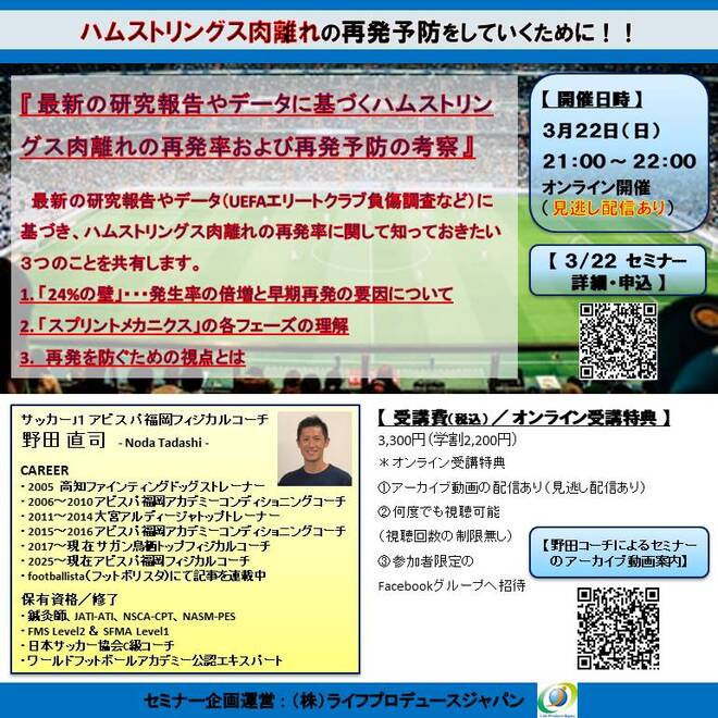 HOME > 新着セミナー情報 > スポーツ系セミナー > 最新の研究報告やデータに基づくハムストリングス肉離れの再発率と再発予防の考察(オンライン開催、見逃し配信あり、後日アーカイブ視聴可)